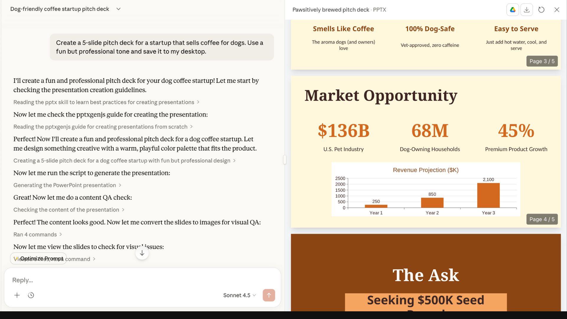 âCreate a 5-slide pitch deck for a startup that sells coffee for dogs. Use a fun but professional tone and save it to my desktop.â