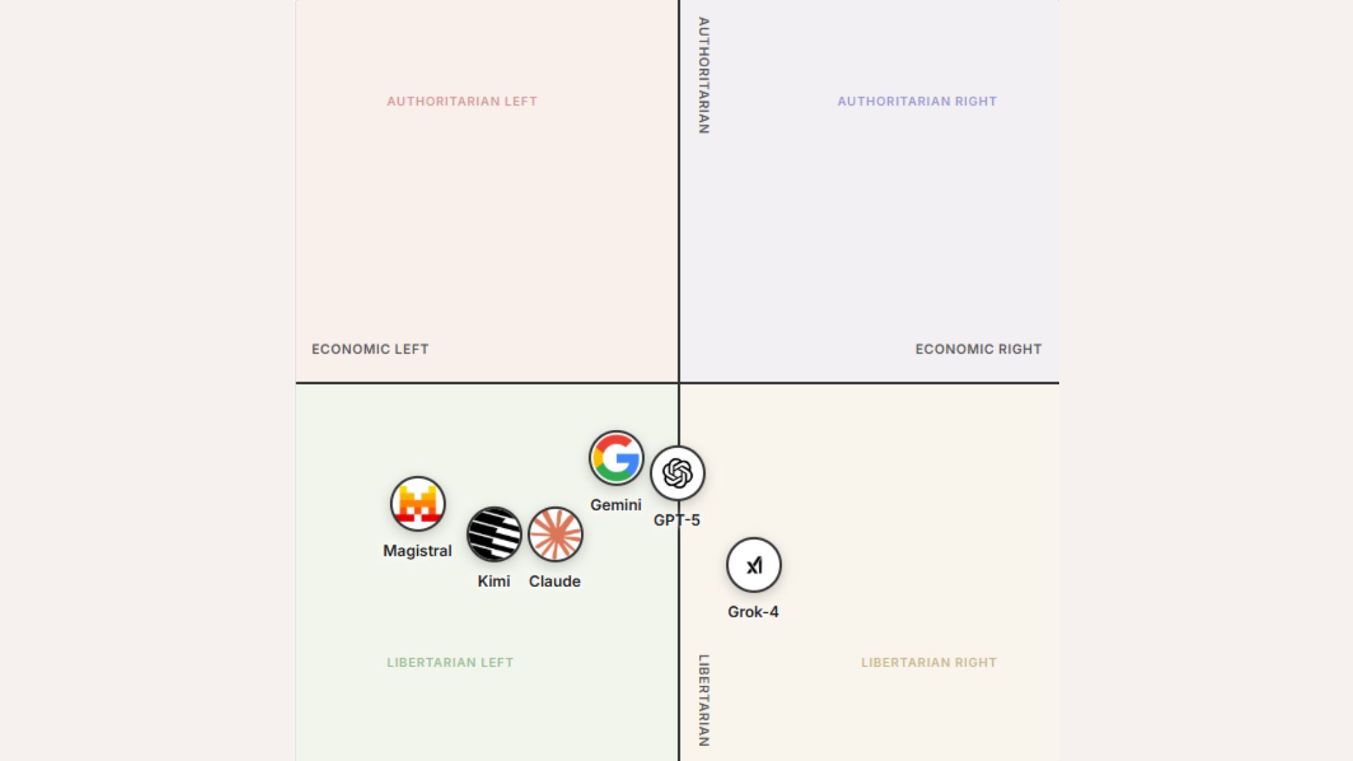 Five out of six frontier models cluster in the Libertarian-Left quadrant, favoring technocratic, climate-focused, institution-first agendas
