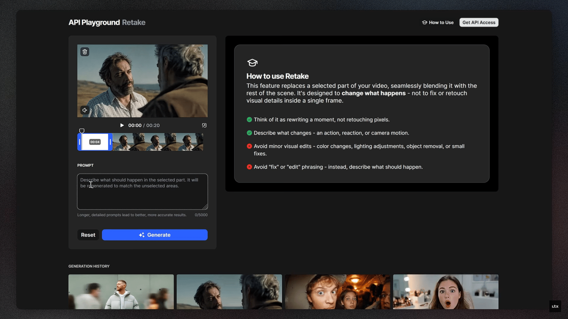 LTX’s new Retake editor lets you rewrite scenes in any video by simply describing the change you want. You upload your clip, select the moment to edit, and LTX regenerates the sequence automatically based on your prompt.