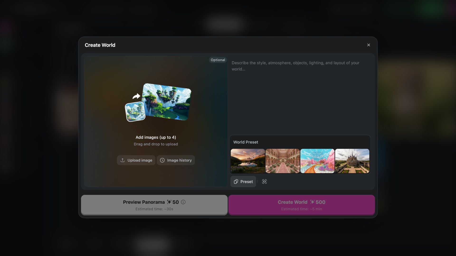 Generates a fully explorable 3D environment from just a single text prompt or reference image.