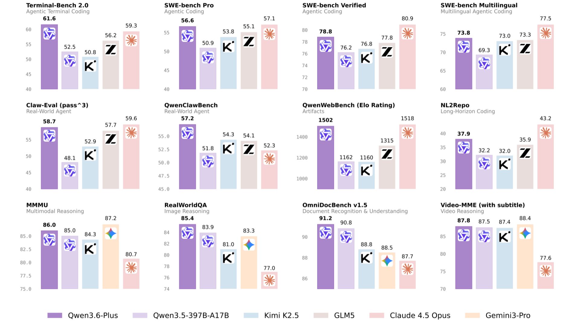 Qwen3.6-Plus outperforms the older Qwen3.5 model and even partially beats Anthropic's Claude 4.5 Opus in internal benchmarks.