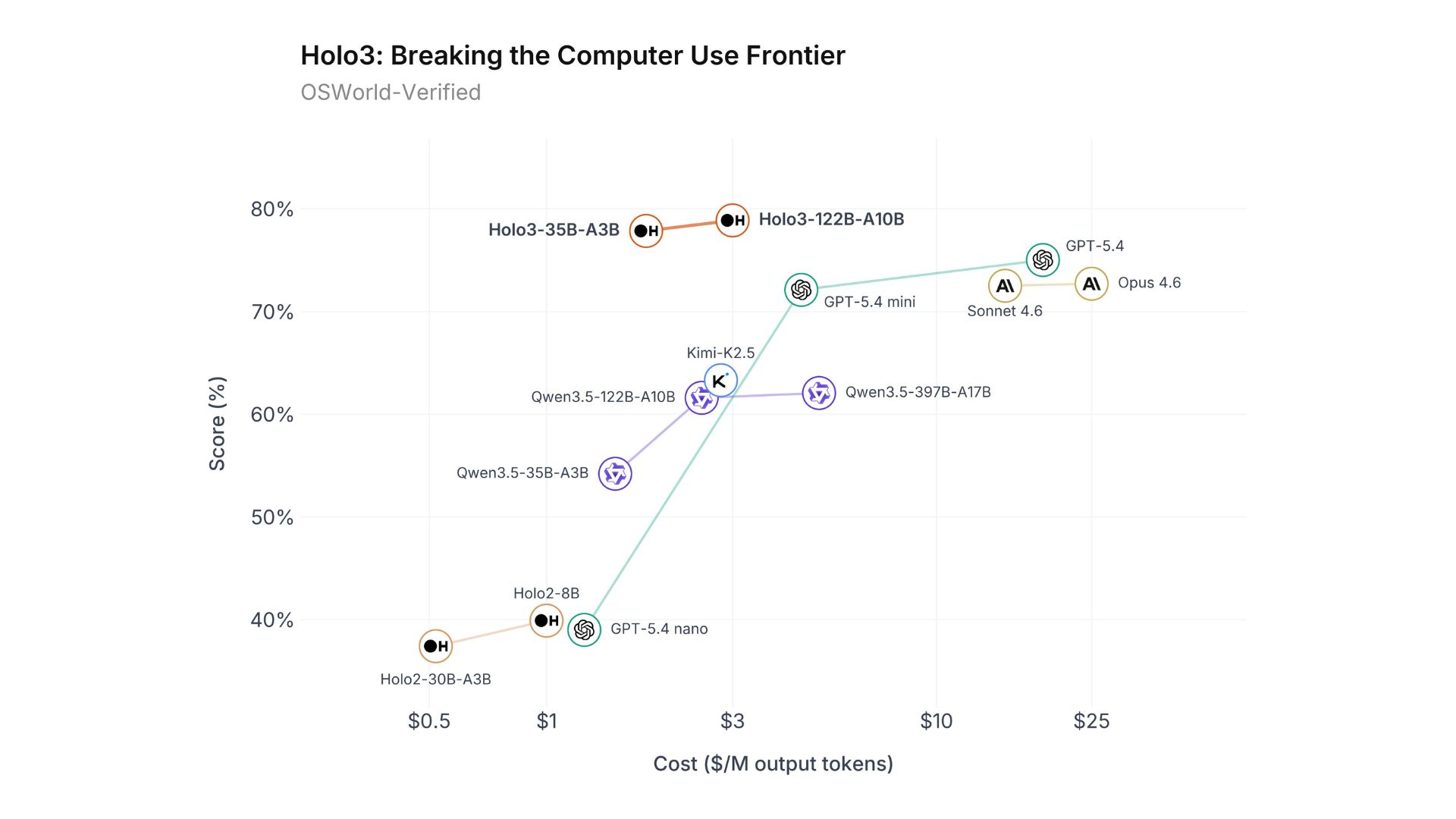 The flagship Holo3-122B-A10B achieved an impressive 78.85% on the OSWorld-Verified benchmark, outperforming mainstream giants like GPT-5.4 and Opus 4.6.