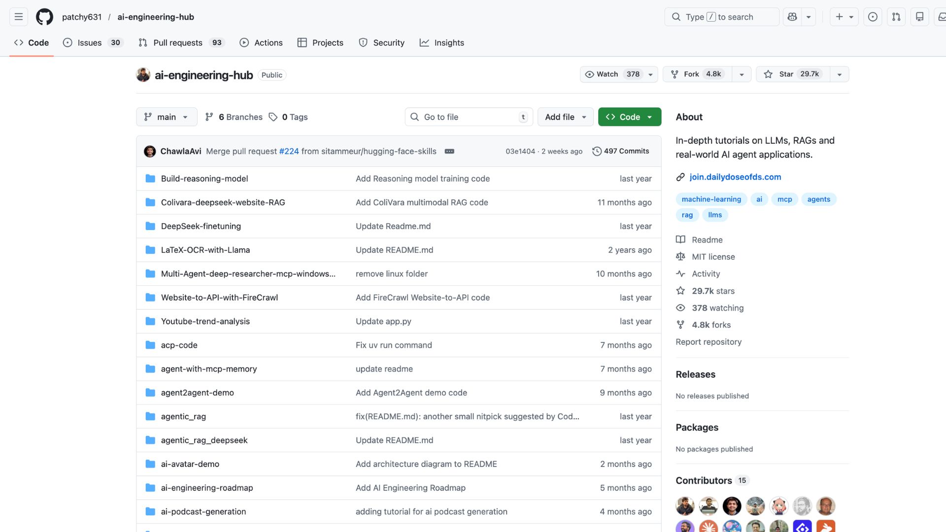 When the page loads, you’ll see a long list of folders and files. Think of this page as a table of contents for modern AI engineering. Each folder represents a complete, standalone project. For example, folders like agent-with-mcp-memory, DeepSeek-finetuning, or RAG-related directories are full implementations, not snippets.