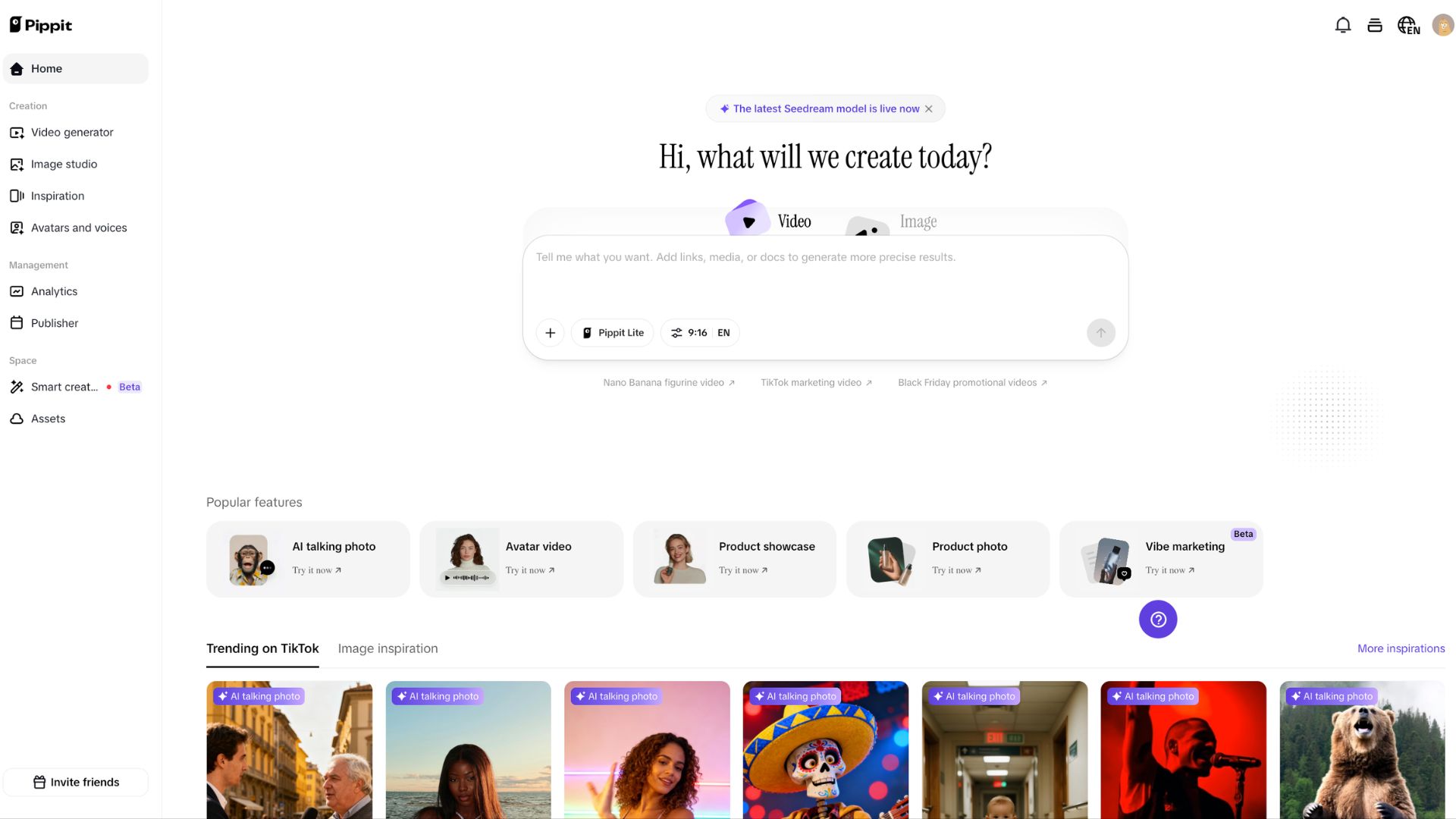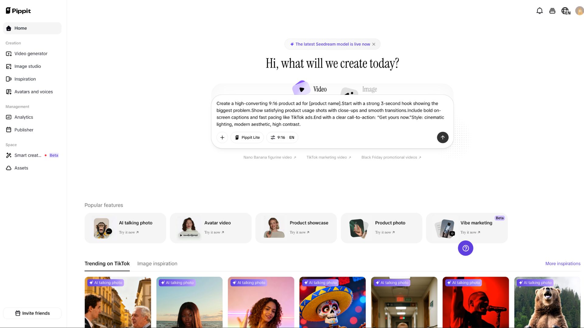 Head over to the pippit.ai home dashboard. This interface acts as an all-in-one centralized space for both image and video generation. Ensure you take note of the top banner, which confirms that the latest Seedream model is currently active for your generations, giving you access to state-of-the-art motion and visual fidelity.
