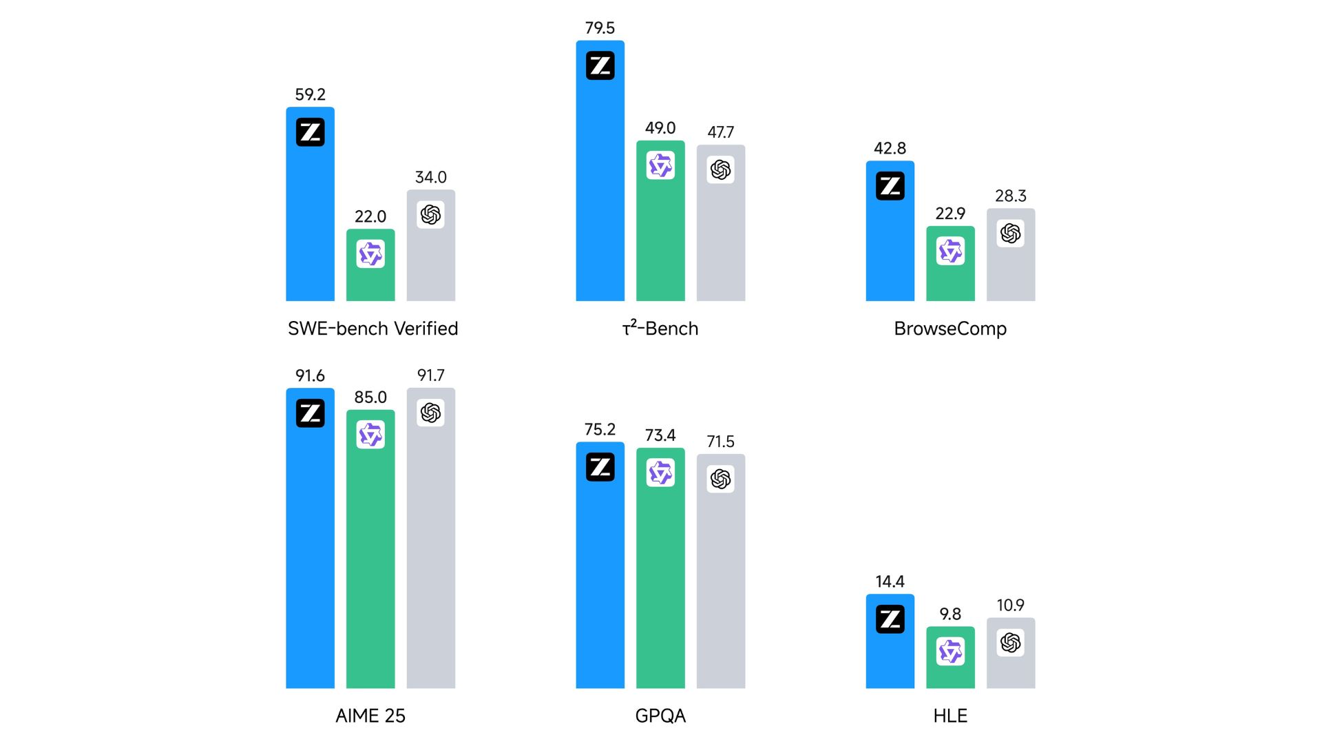 Leads agentic benchmarks like SWE-bench, τ²-Bench, and BrowseComp
