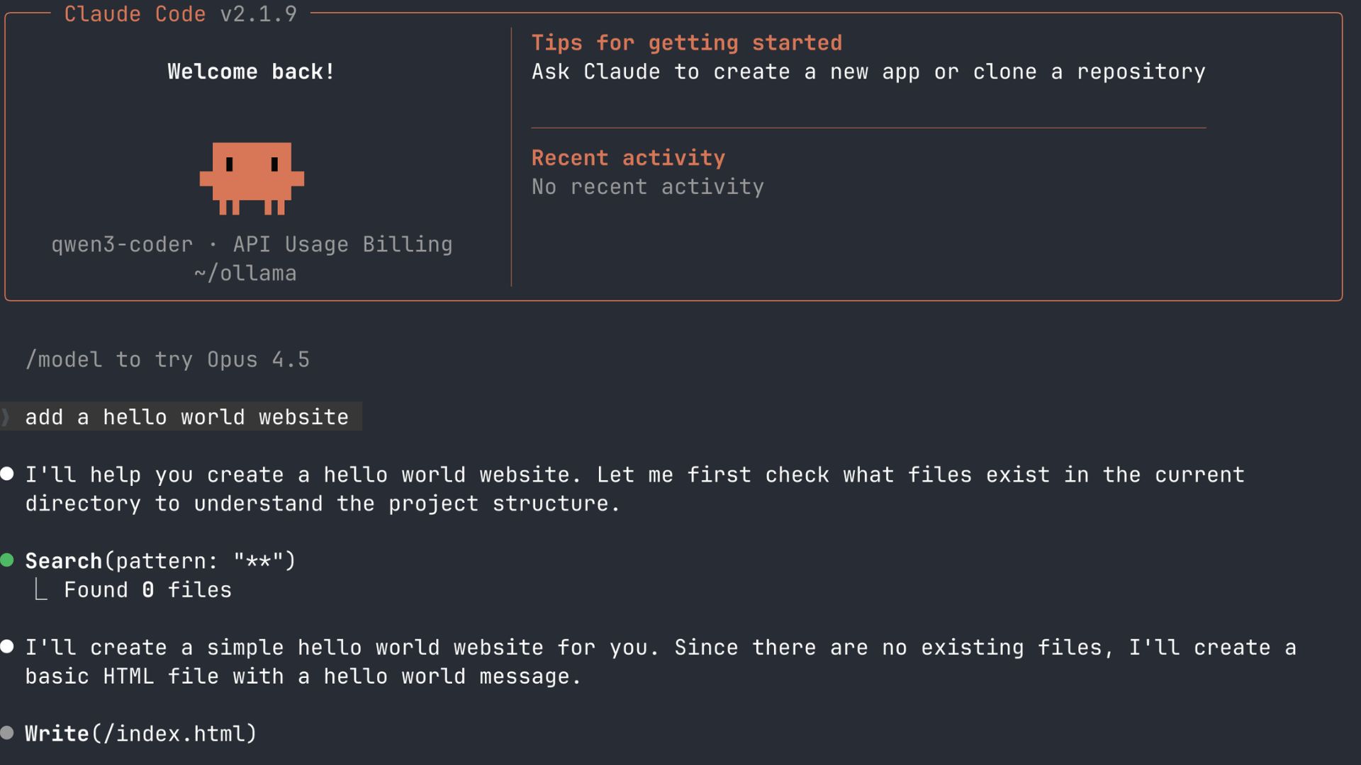 Navigate to any project folder in your terminal and launch Claude with your selected model. For example:claude --model qwen3-coder:30b