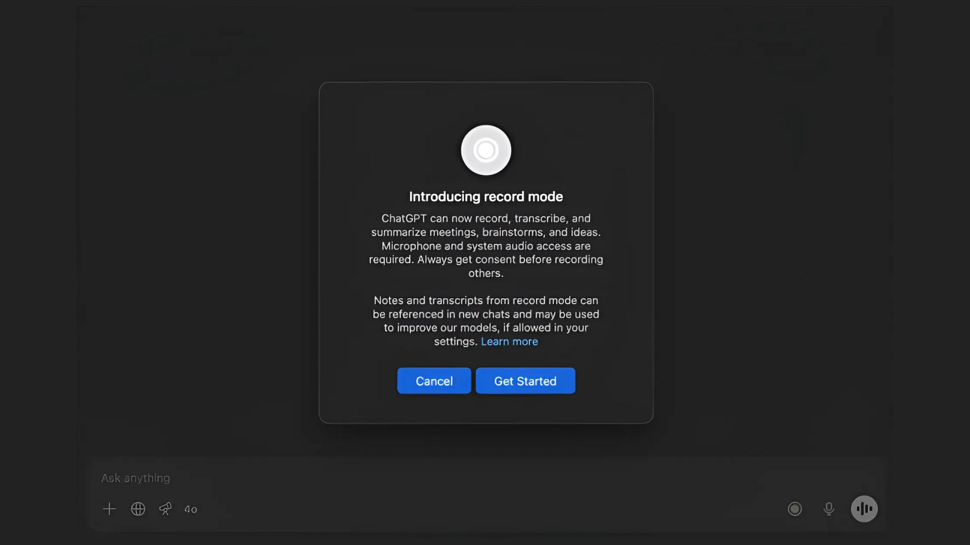 Open the native ChatGPT desktop app on your macOS system. To begin, click the Record button located at the bottom of the chat screen. The first time you do this, your Mac will prompt you to grant the necessary permissions, approve these so the app can seamlessly capture both your microphone and the system audio.