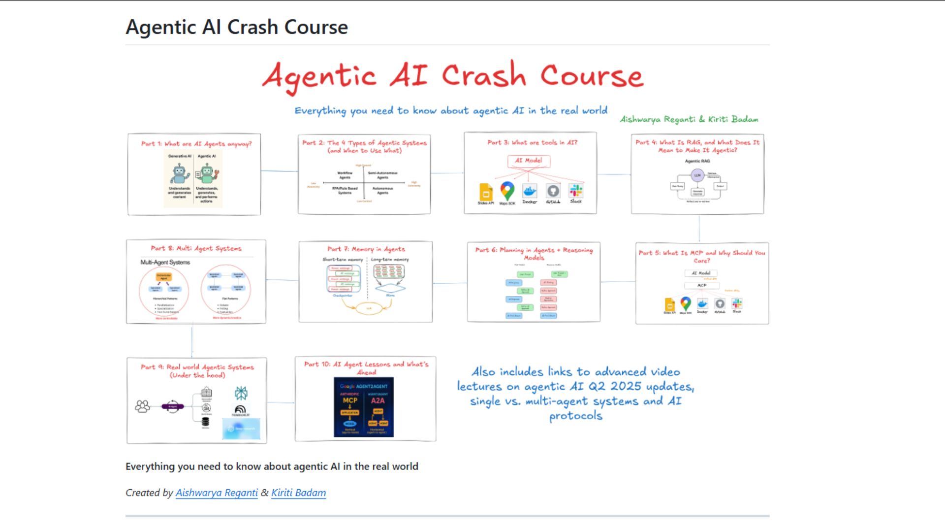 Use the left sidebar to navigate through each chapter file, starting from Part 1 and moving to Part 10. Each chapter explains a specific core concept such as the difference between agents and plain generative AI, the four agent types, tools and tool integration, RAG vs agentic RAG, MCP, planning, memory systems, multi-agent coordination, deployment workflows, and industry trends. You can read everything directly inside GitHub, with diagrams and explanations included in each section.