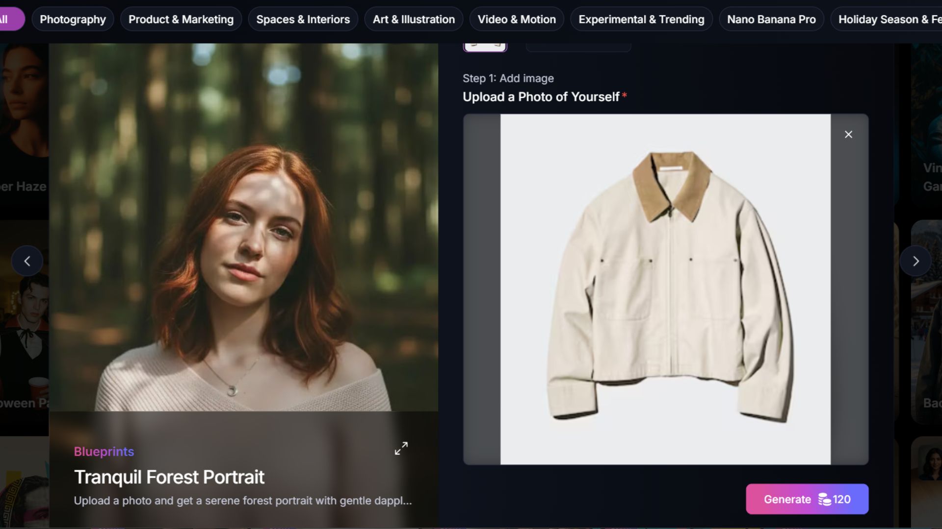 Scroll through the available workflows and click on one that matches what you want to create, such as Product Lifestyle Photoshoot or Tranquil Forest Portrait. Each blueprint is a complete, optimized workflow built for a specific result.