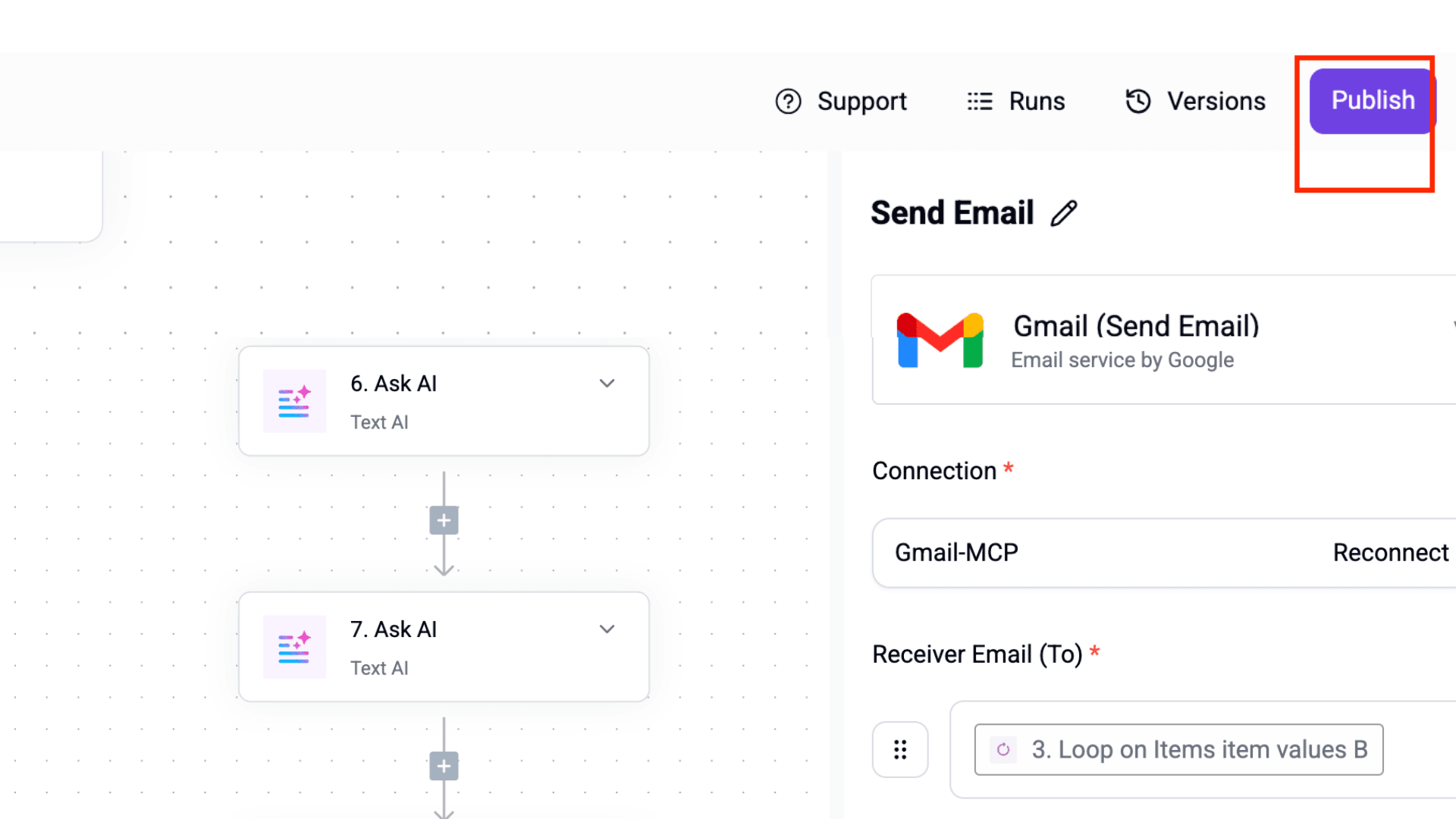 Once all steps are set, click “Publish“ button at the top right. Your AI Sales Agent will now run automatically on your schedule.