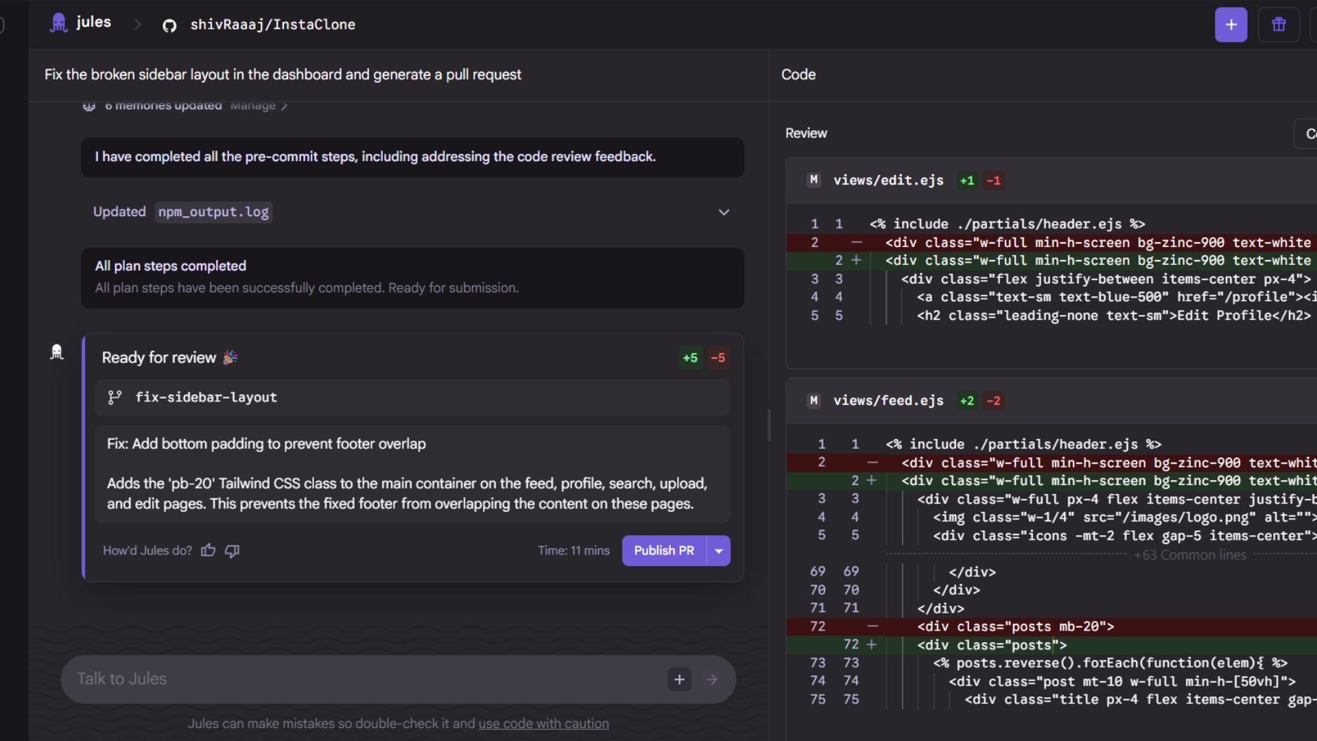 For example: “Fix the broken sidebar layout in the dashboard and generate a pull request.”