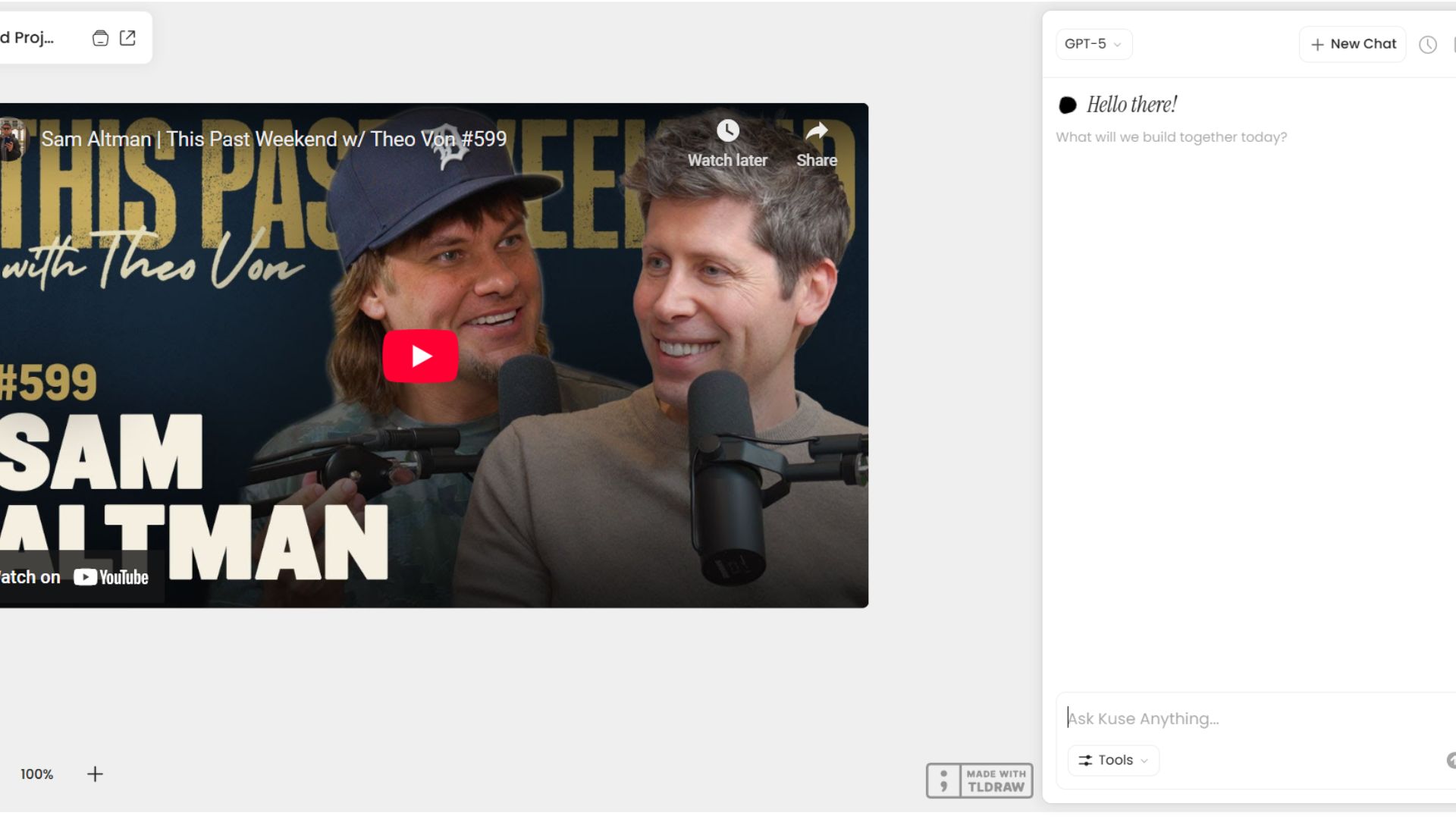 Kuse will automatically process the video, extract the transcript, detect topics, and generate insights. Once done, a thumbnail of the Sam Altman interview will appear on your canvas in the center of the screen.