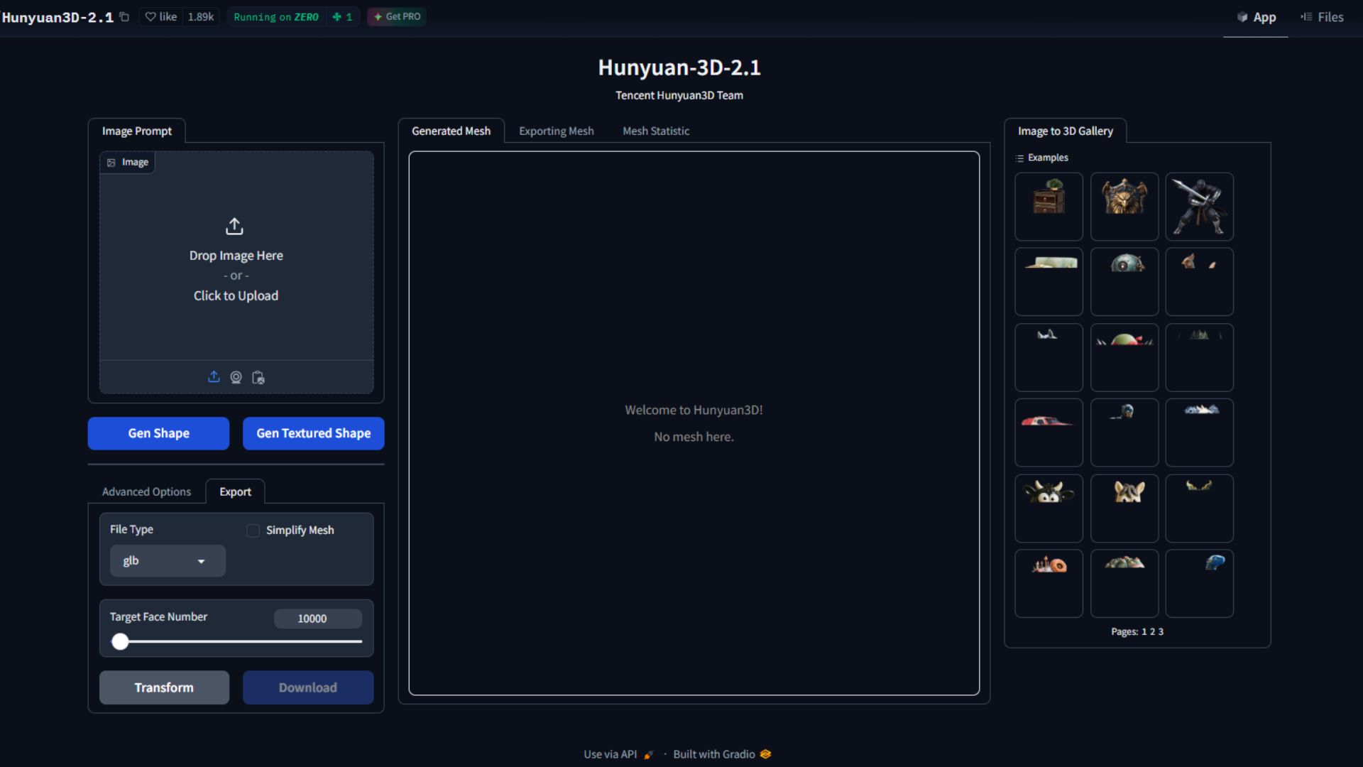 Once loaded, you’ll see a simple layout: an image upload box on the left and a 3D preview window on the right.
