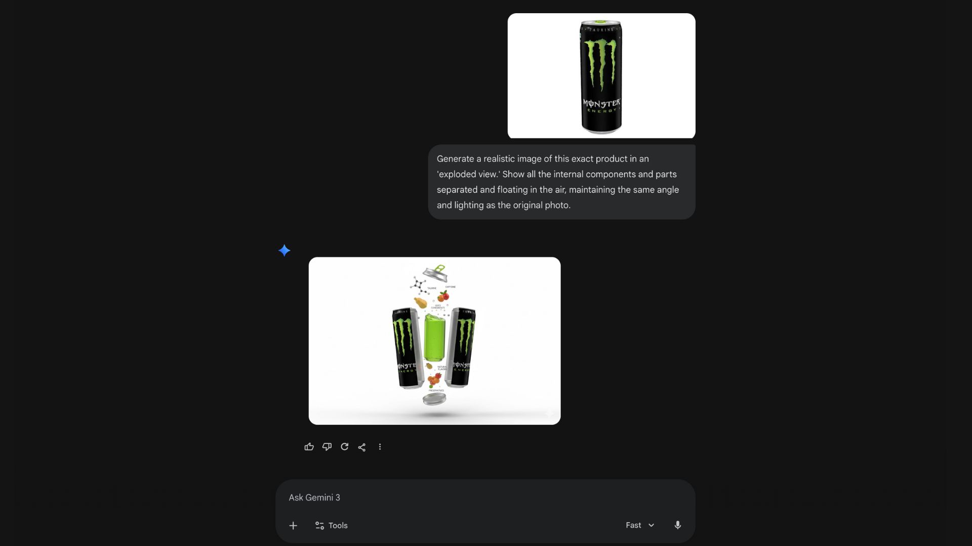 Open Google Gemini and upload the hero image from Step 1. Once the image is uploaded, ask Gemini to generate an exploded view of the exact same product.
