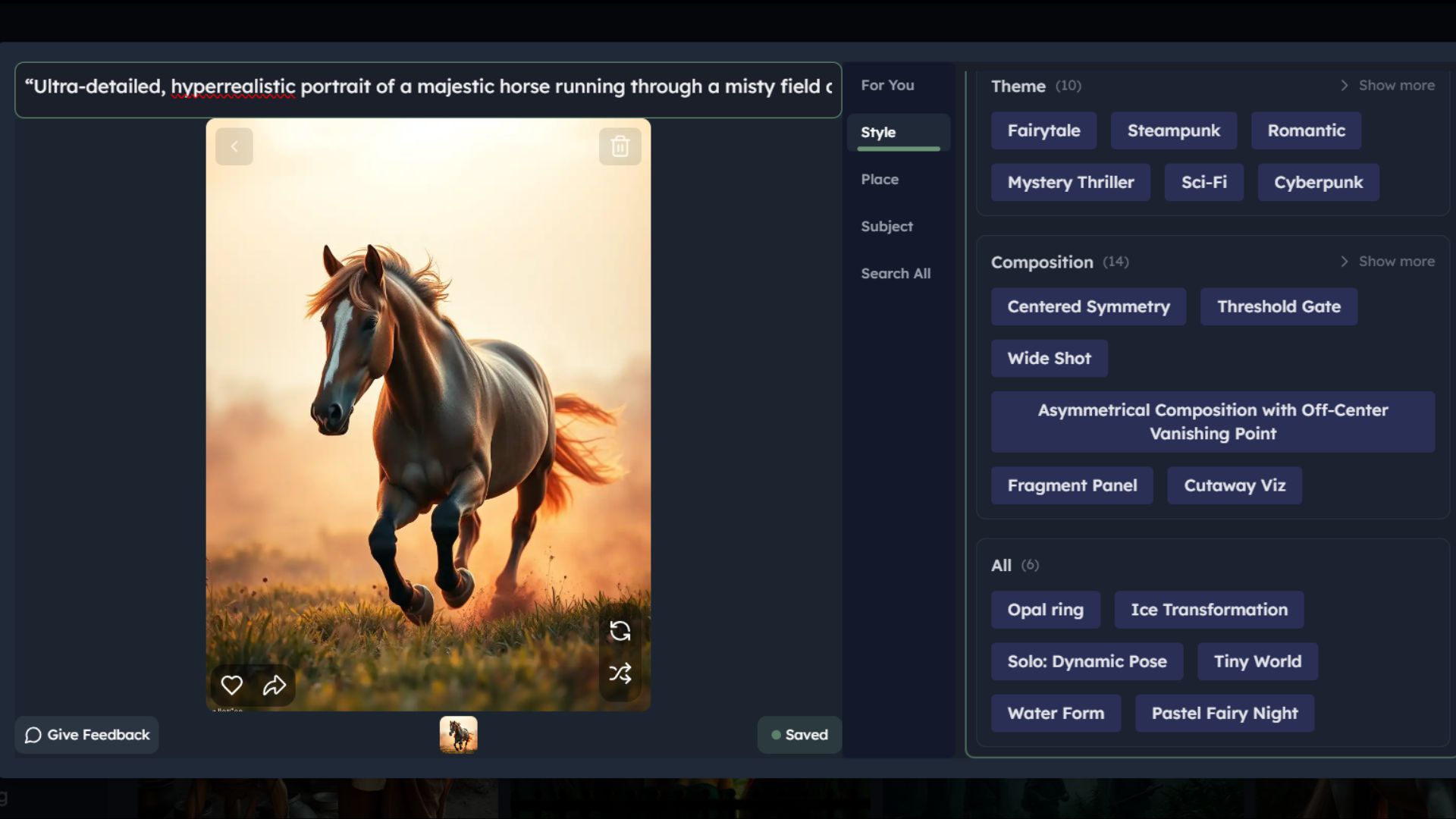 “Ultra-detailed, hyperrealistic portrait of a majestic horse running through a misty field at sunrise, golden light shining through the fog, soft dust trails behind, cinematic composition, natural motion blur, glossy mane flowing in the wind, captured with a Canon EOS R5 and 85mm lens, 8K resolution, masterpiece, photorealistic, volumetric lighting, depth of field.”