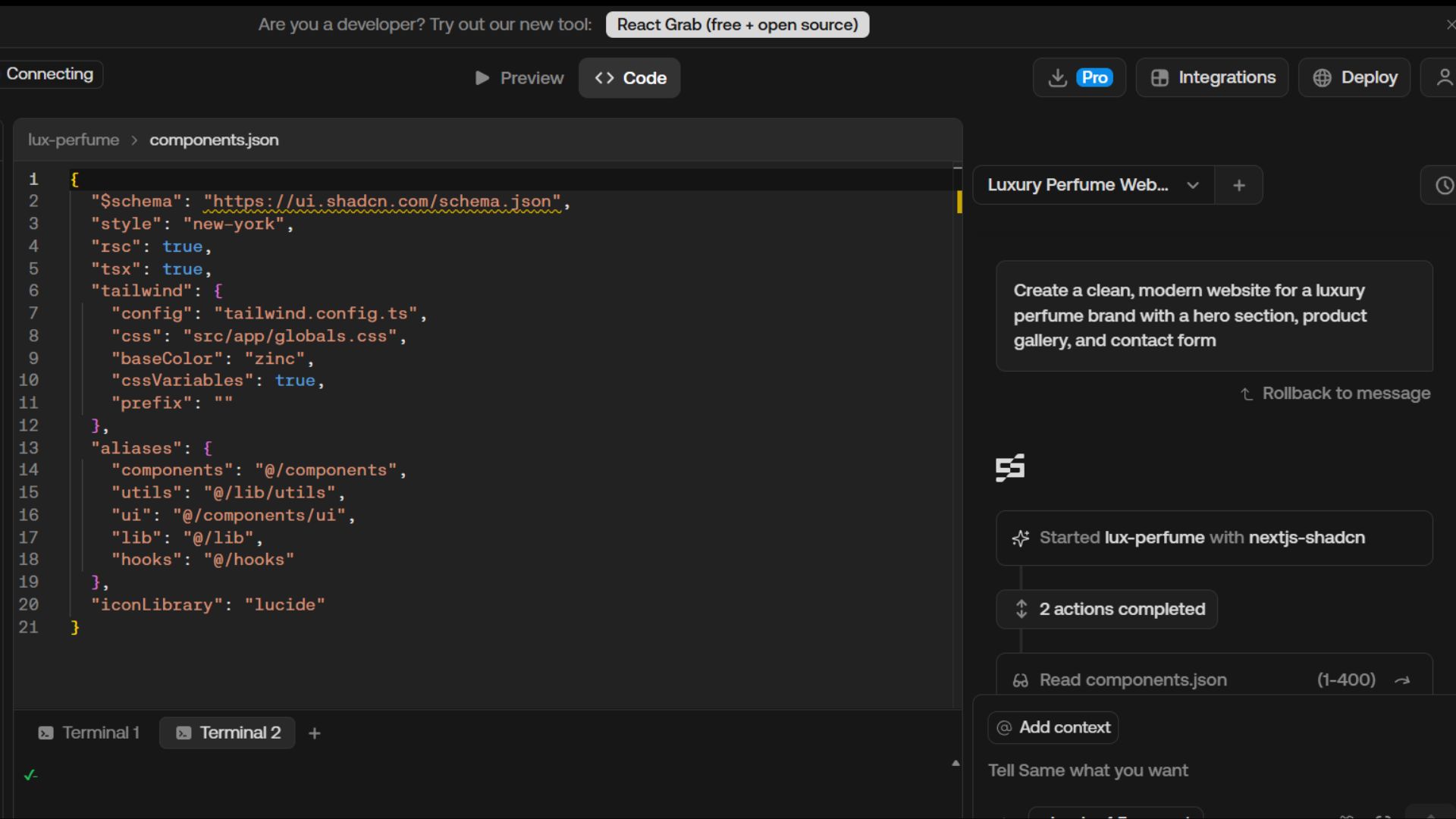 “Create a clean, modern website for a luxury perfume brand with a hero section, product gallery, and contact form.”