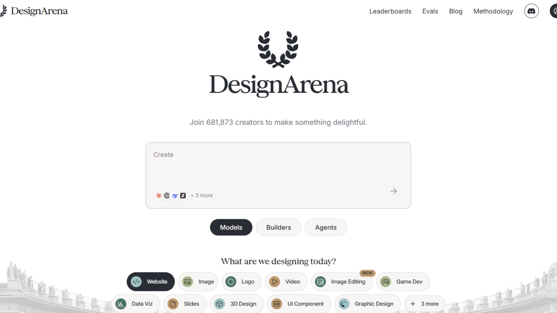 Open your browser and go to designarena.ai. When the page loads, you’ll immediately notice how clean and simple the interface is. In the center of the screen, there’s a large text input box designed for prompts. Just below it, you’ll see different creation categories such as Website, Image, Logo, and Video.