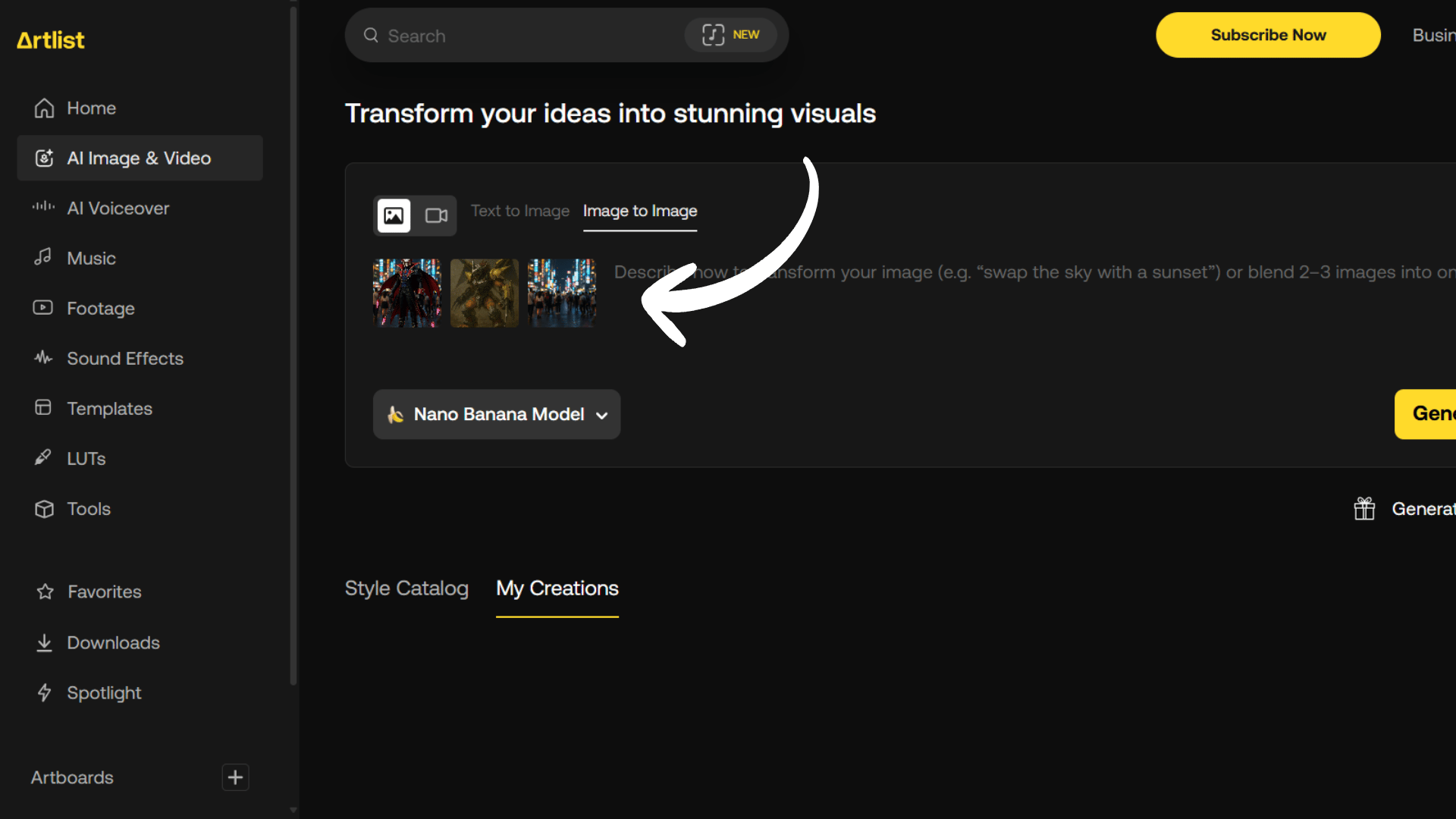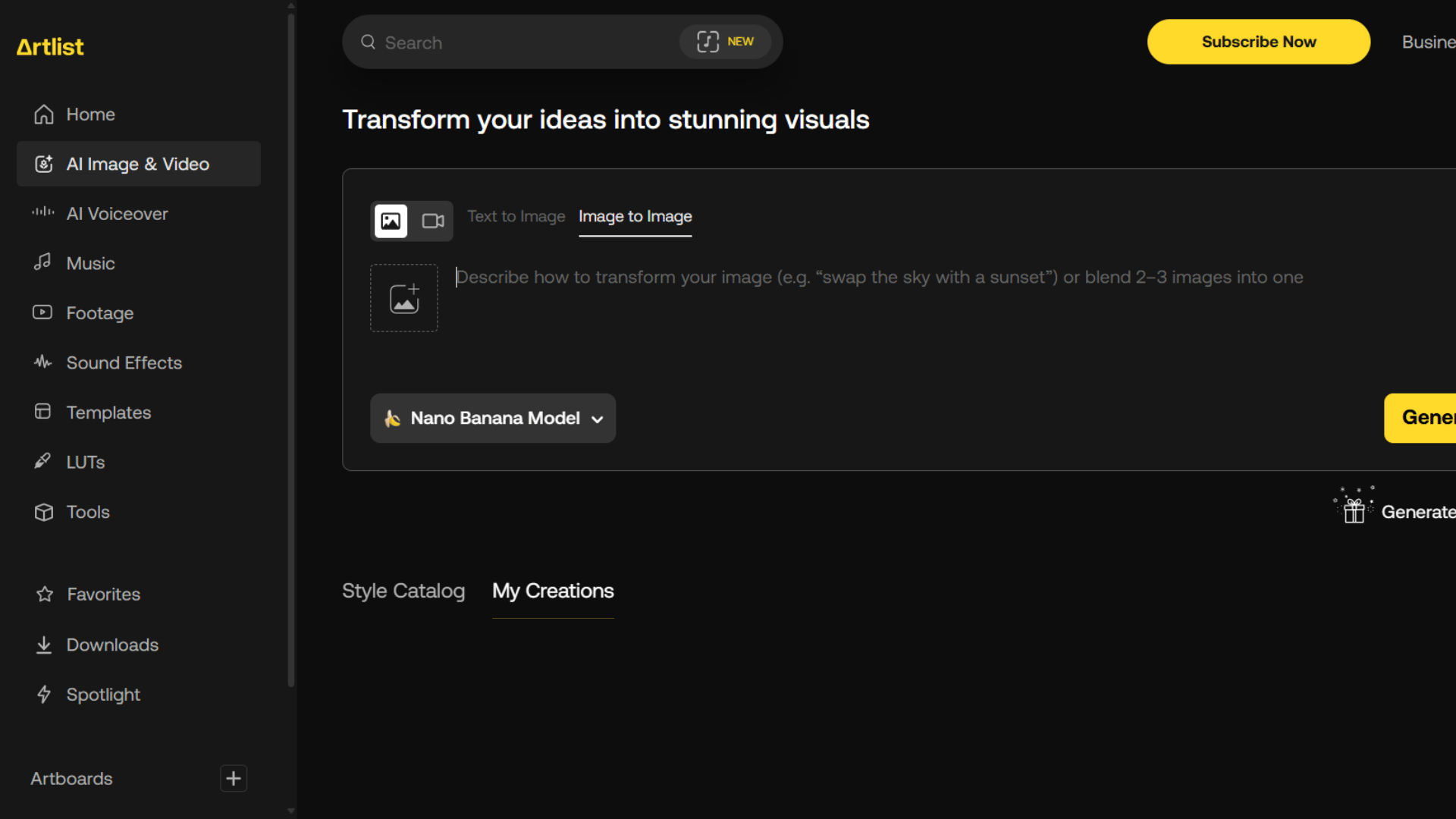 Head over to Artlist AI and sign up for a free account. Once you log in, you’ll land on the main dashboard. In the center of the screen, you’ll see a large prompt box where you can type your ideas.