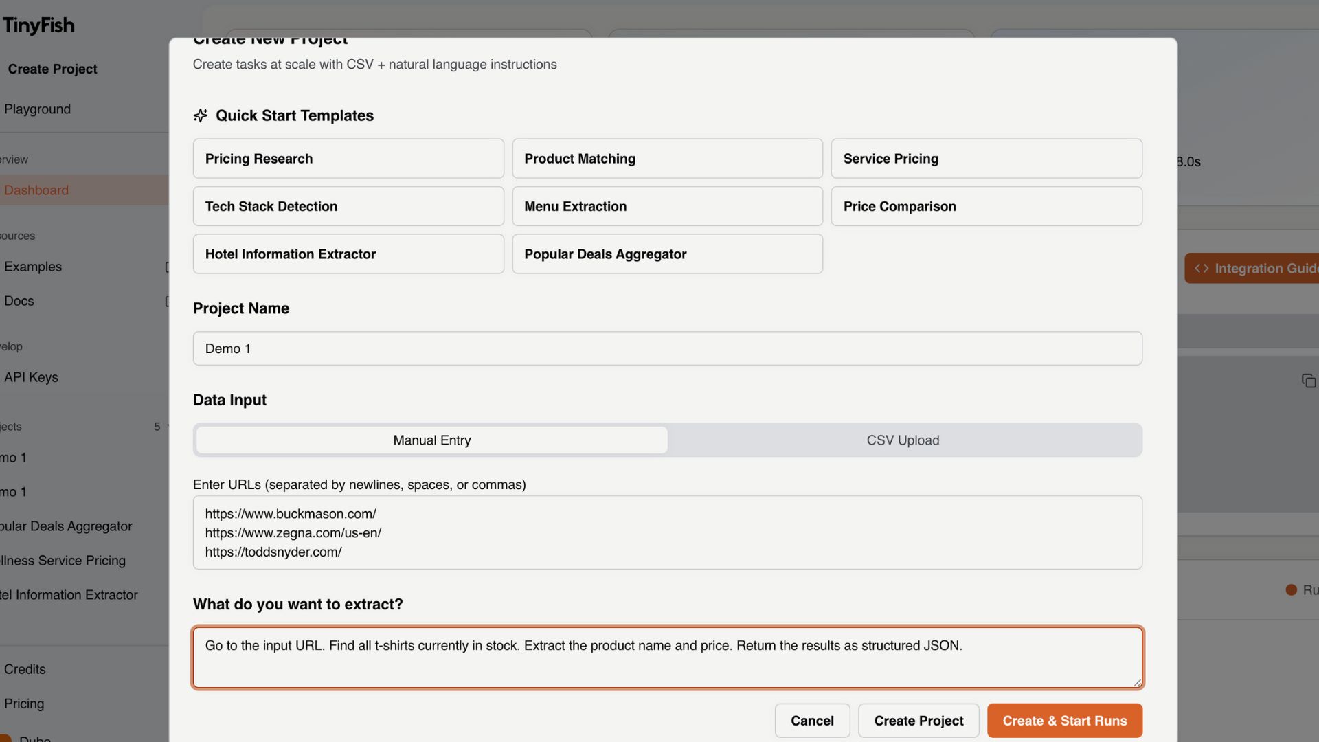 To create a new project, locate the “Create Project“ button on top left corner and click it. You’ll immediately notice that everything revolves around a single prompt. In the prompt field, clearly describe what you want the agent to do on a website.
