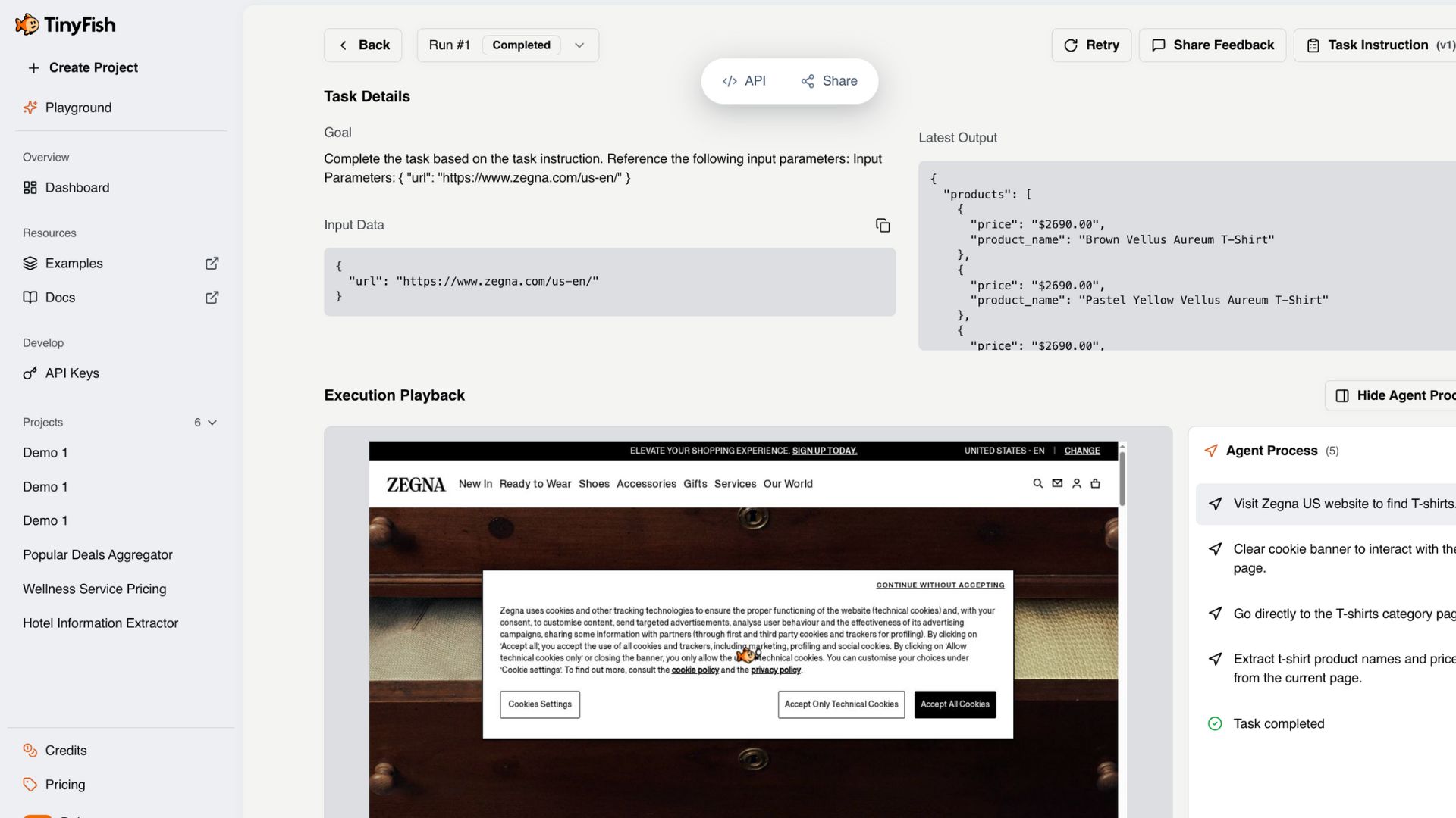 This is where Mino shines. The agent adapts to each site in real time using browser automation instead of rigid rules.