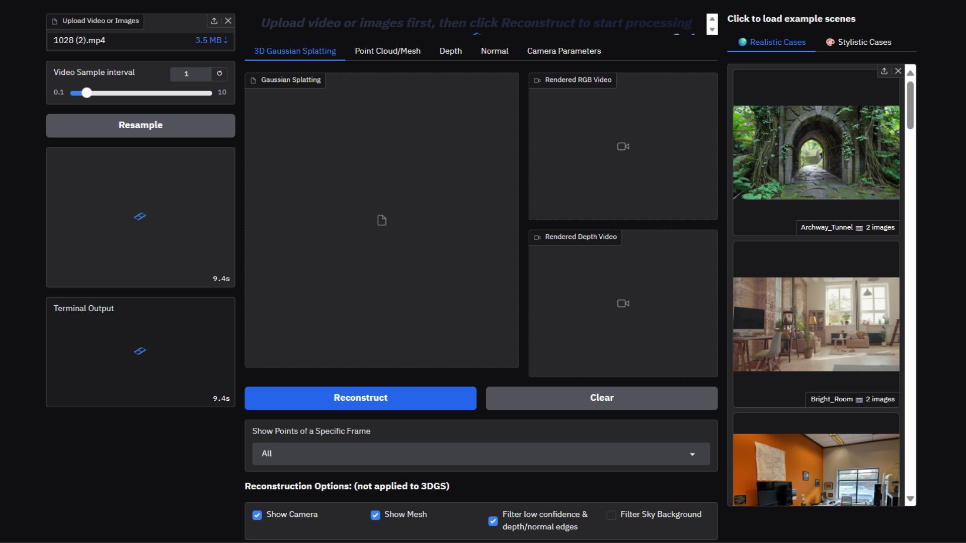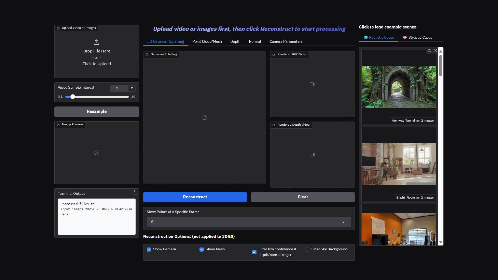 As the process runs, different viewers on the screen gradually fill with results: your 3D world, a new rendered RGB playback, and a depth view. Depending on server load, the entire reconstruction usually finishes in a few seconds to a couple of minutes.