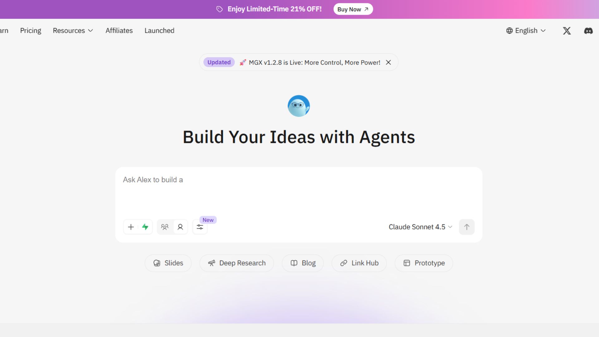 At the center, you’ll see a large text box labeled “Ask Alex to build a…”, this is where you provide your prompt or project goal.