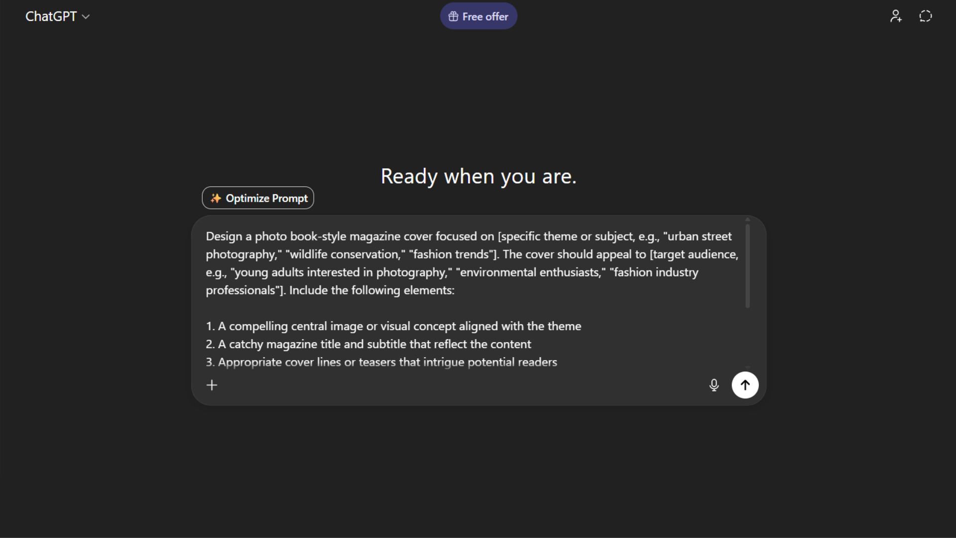 Instead of overthinking your prompt, just type your idea in the most basic way possible. For example, you might write something like, âCreate a photo book style magazine cover.â Donât worry about structure, detail, or wording.
