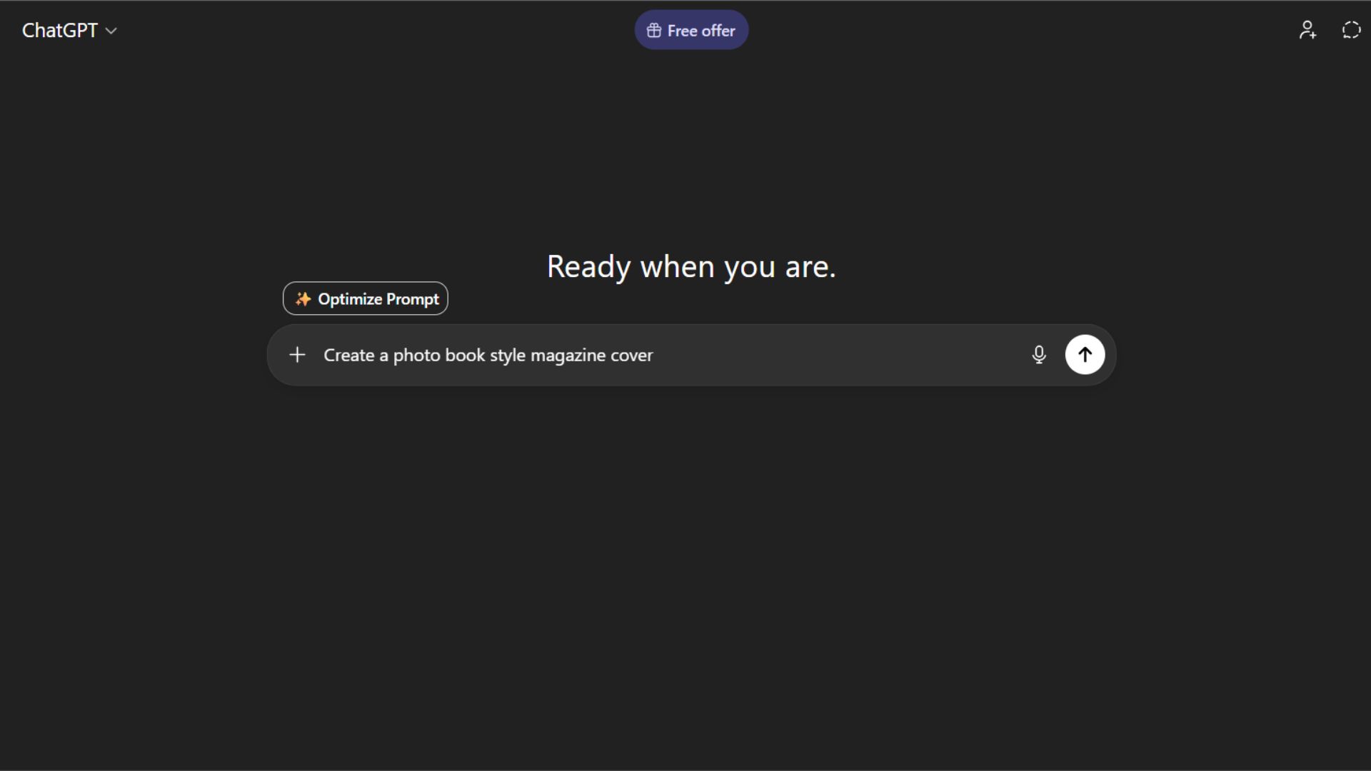 Instead of overthinking your prompt, just type your idea in the most basic way possible. For example, you might write something like, “Create a photo book style magazine cover.” Don’t worry about structure, detail, or wording.