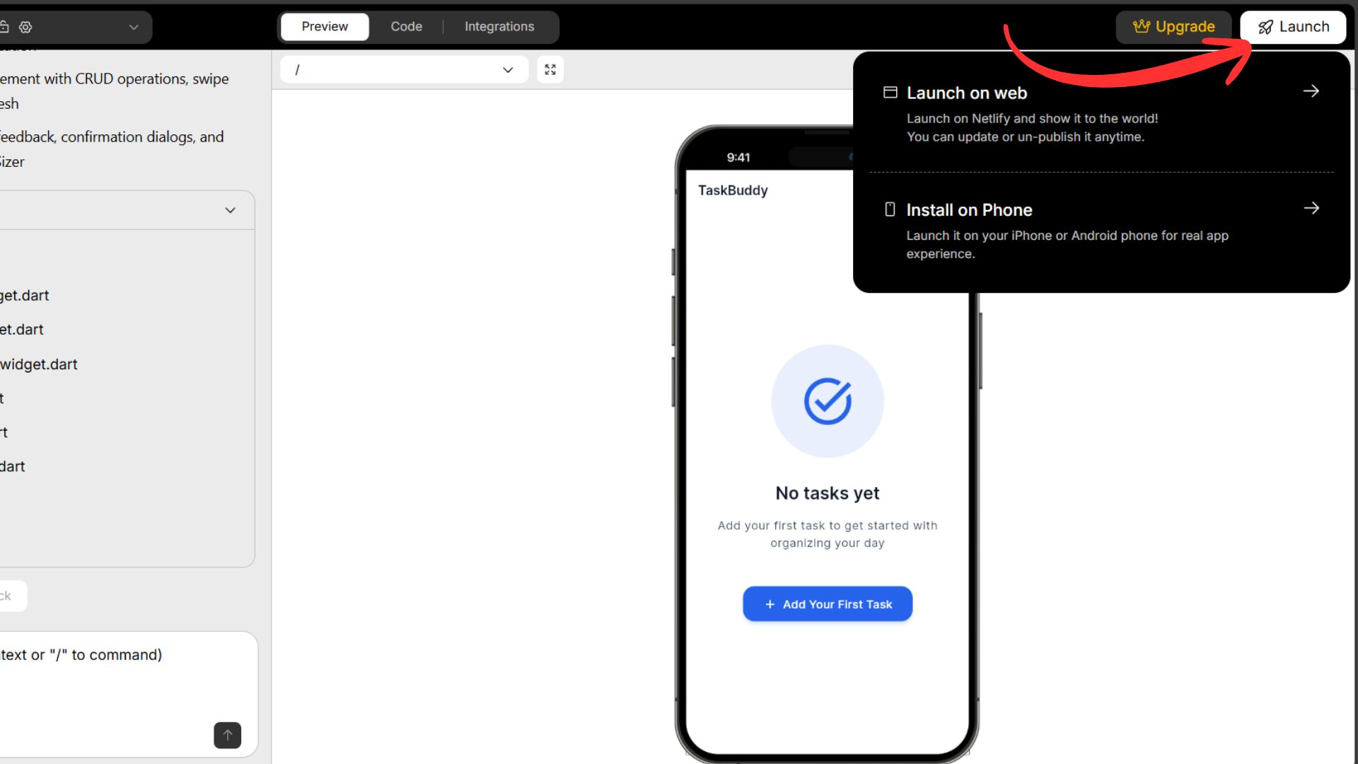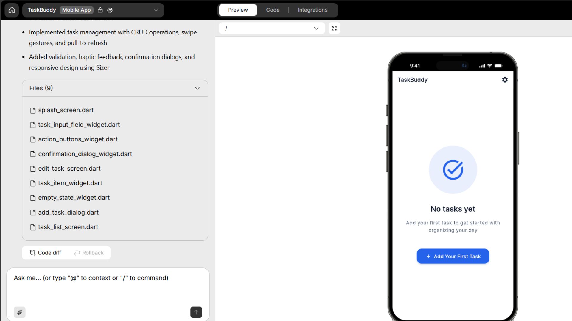 You’ll see it create project files automatically on the left (like main.dart, task_list_screen.dart, etc.) and a live app preview on the right.