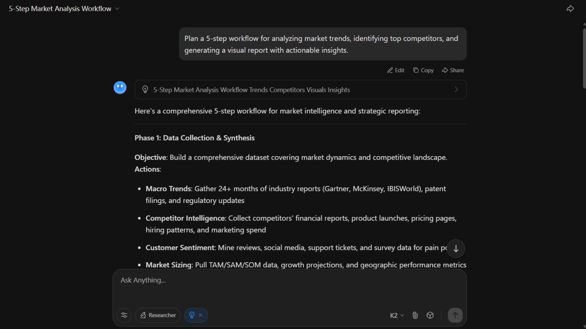 “Plan a 5-step workflow for analyzing market trends, identifying top competitors, and generating a visual report with actionable insights.”