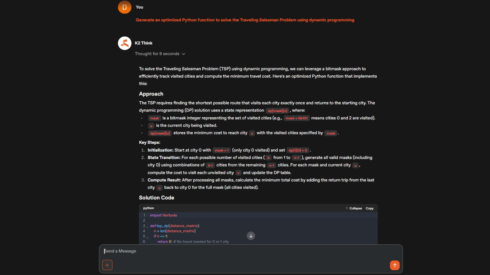 For example: "Generate an optimized Python function to solve the Traveling Salesman Problem using dynamic programming"