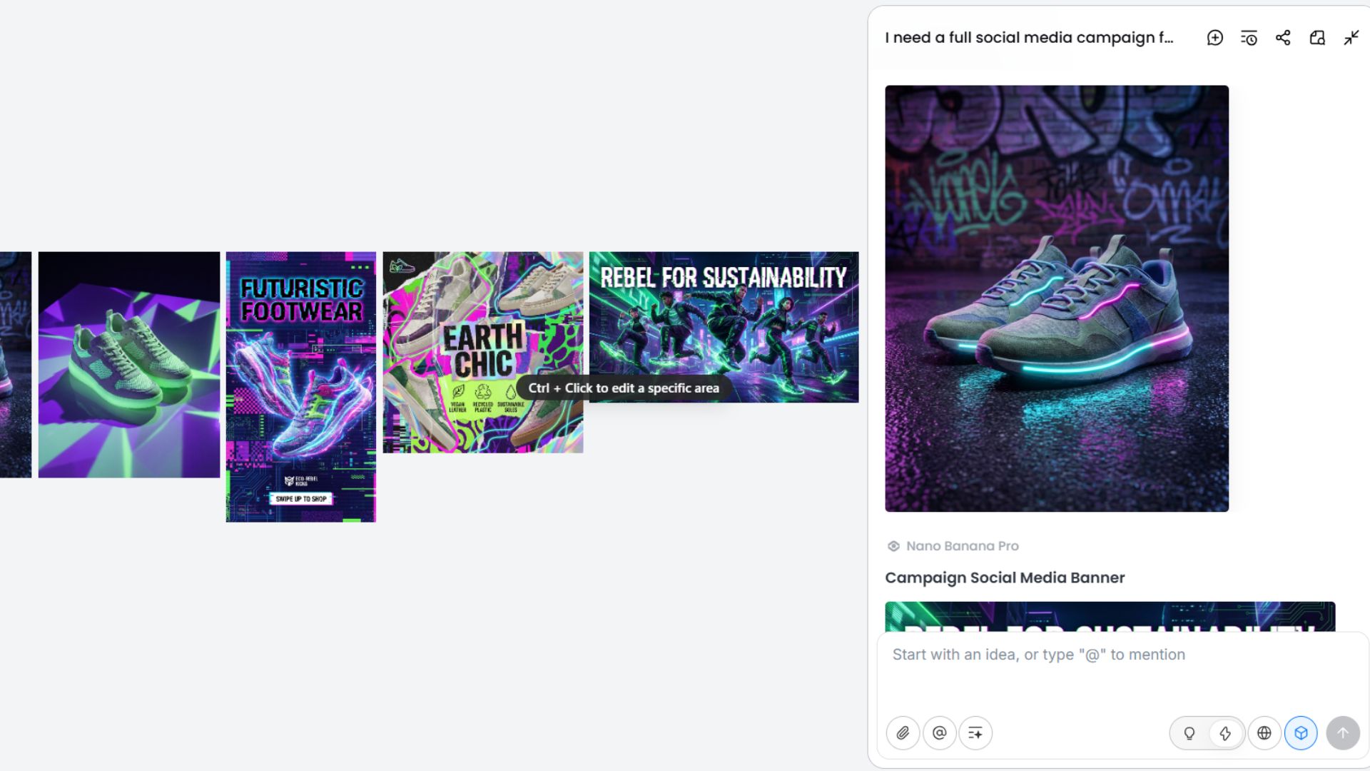 For example, I might say: “I need a full social campaign for a new line of futuristic, eco-friendly sneakers. The vibe should be rebellious and vibrant, and the main assets should be product photoshoots for social ads.”