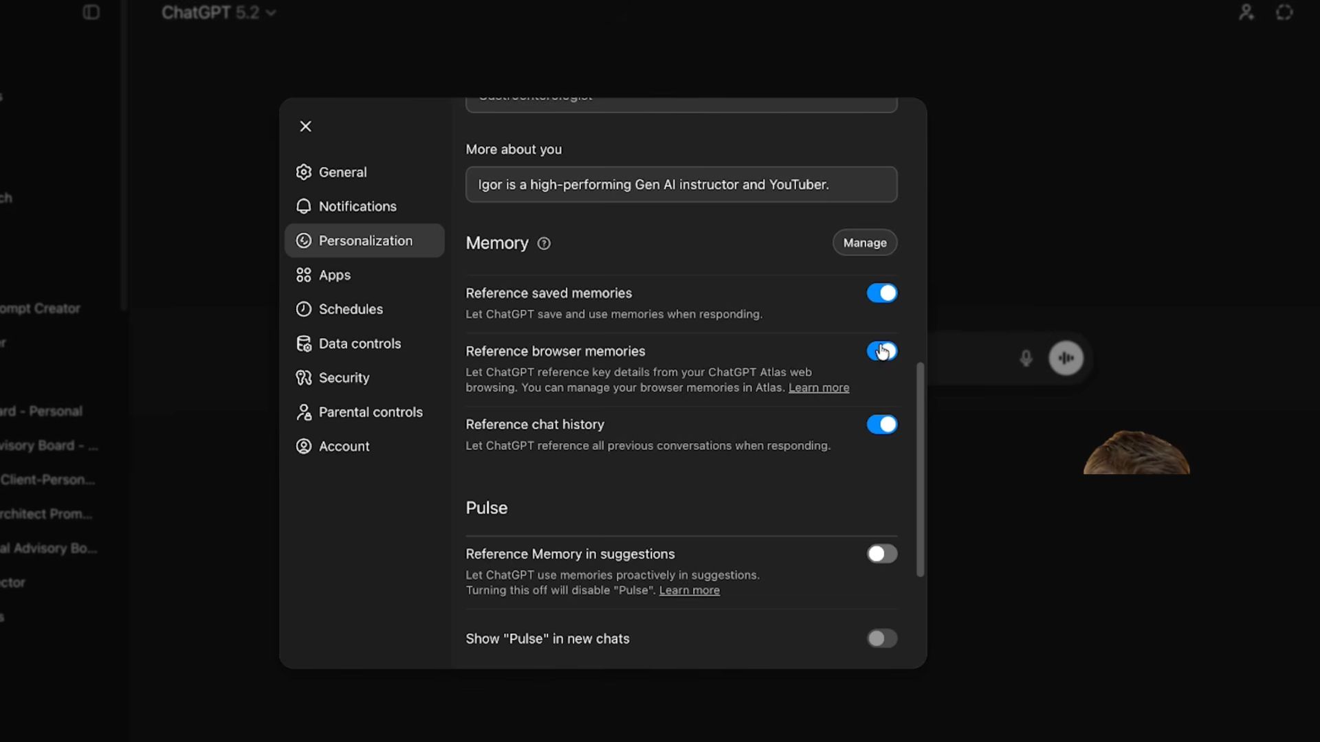 Head over to your ChatGPT account. Before pasting the prompt, click your profile picture, go to Personalization, and verify that Reference saved memories, browser memories, and chat history are all toggled on.