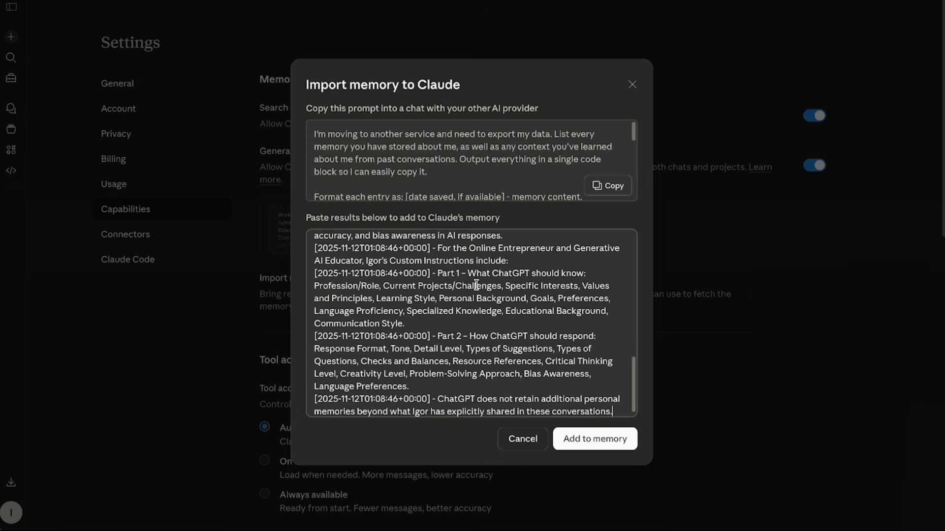 Now copy the generated code block from ChatGPT and return to the open import window in Claude, paste the entire block into the text field, and click Add to memory. Claude will automatically format this raw data into cleanly categorized, easy-to-read memories.