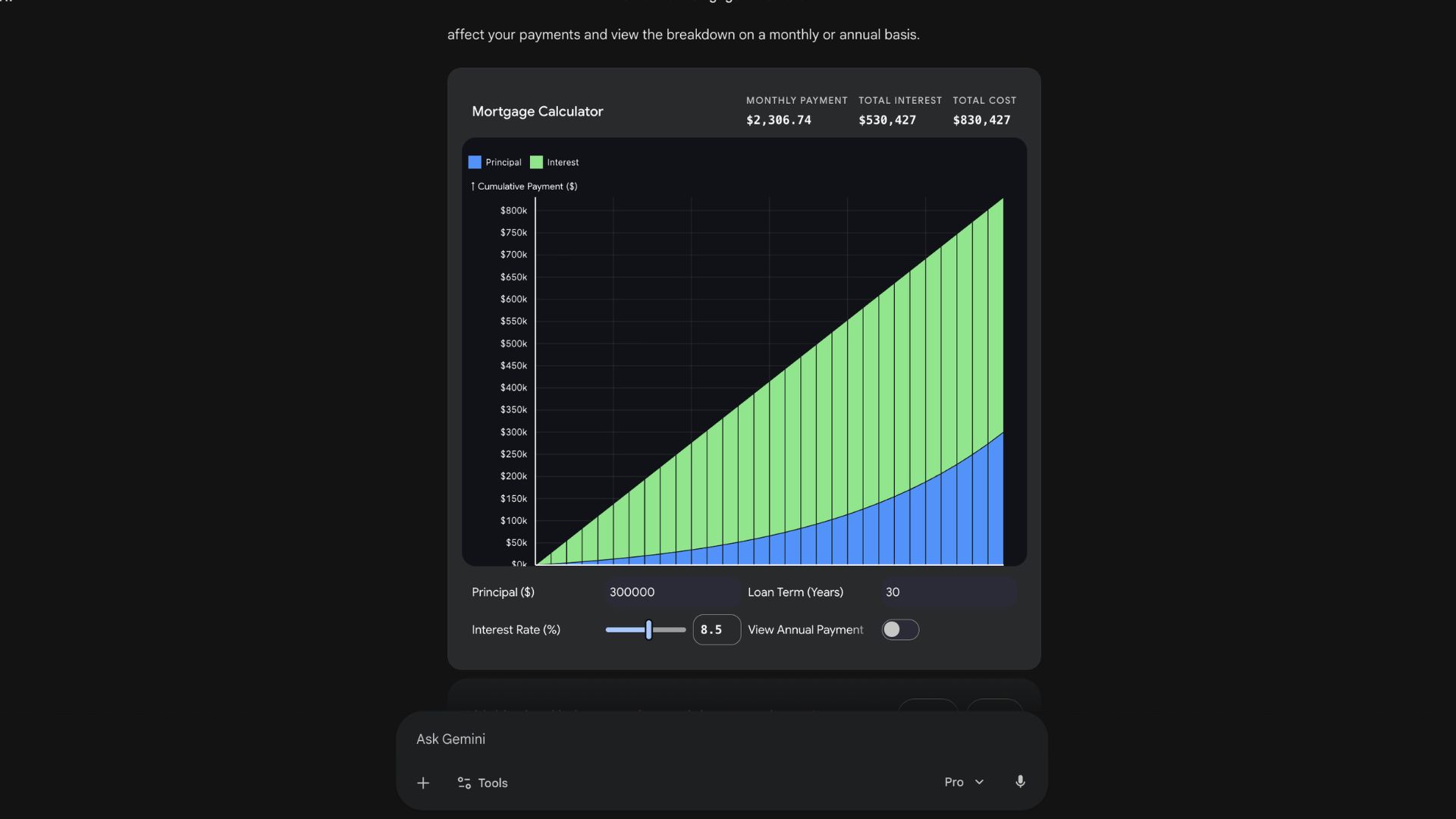 Example: "Visualize a mortgage calculator with a slider for interest rates and a toggle for monthly versus annual views."
