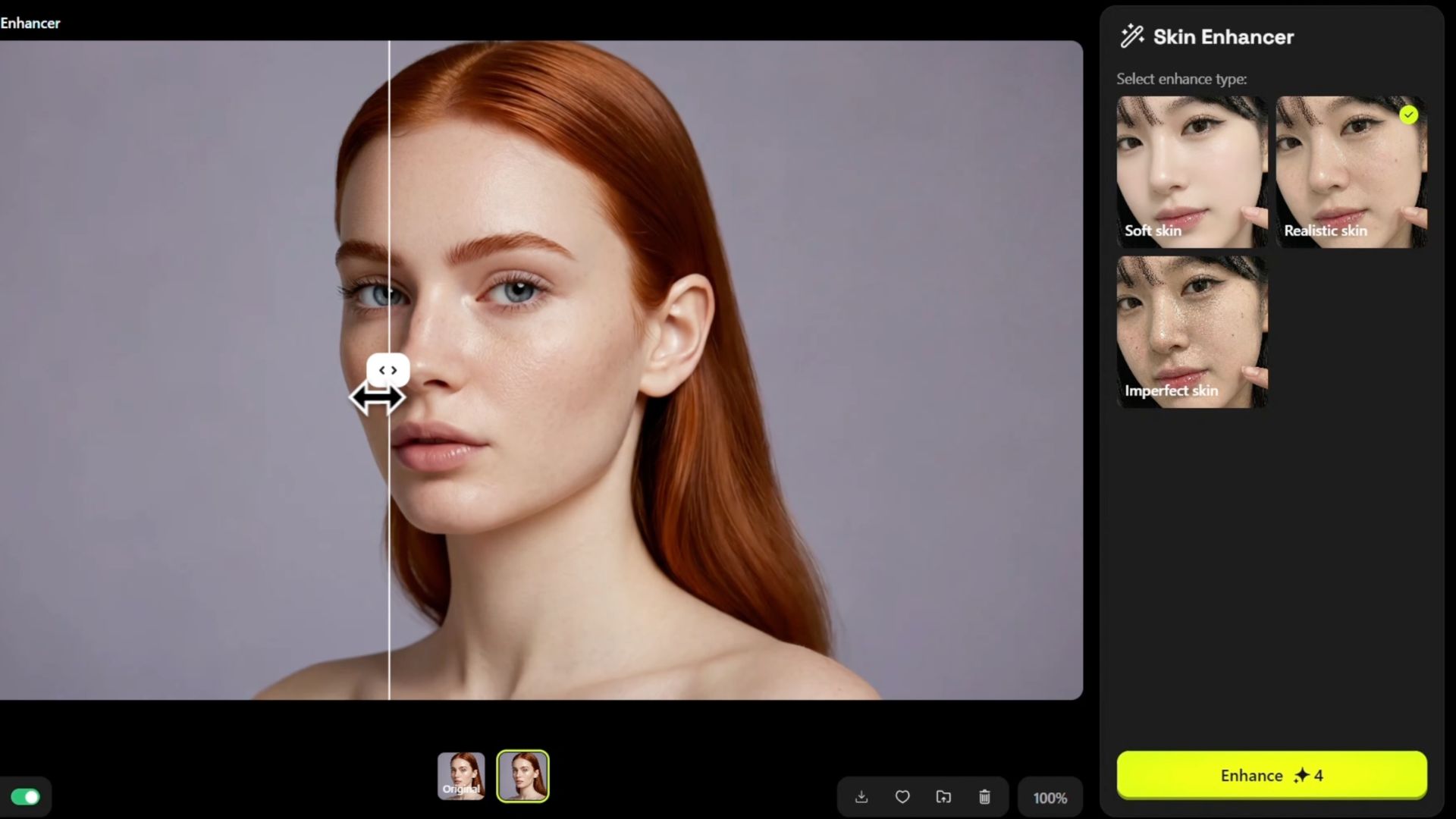 You will see options for soft, realistic, and imperfect skin. Choose the realistic option for the most natural, human look. Click enhance, which uses just 4 of your daily credits, wait a few seconds for the render to complete, and hit download to save your hyper-realistic final asset.