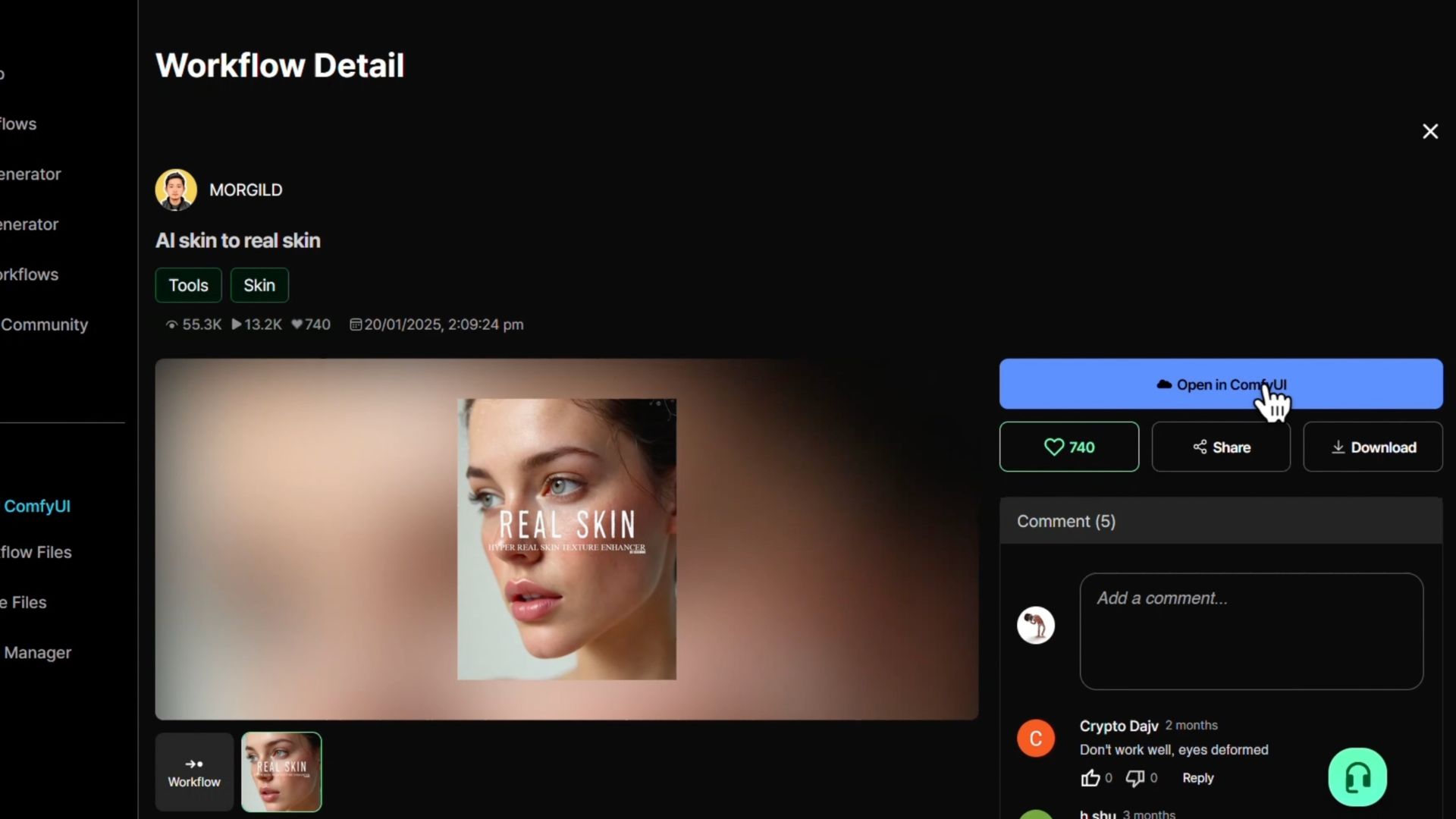 Head over to the Nordy AI platform and sign in using your Google account. Now locate the search bar at the top and search for "AI skin" in their library and click to open the easy app result you’ll see. Then you’ll see the option to open this app directly in ComfyUI. Once you open app in ComfyUI, zoom in slightly on the interface, click on direct upload, and drop in your overly smooth AI photo.