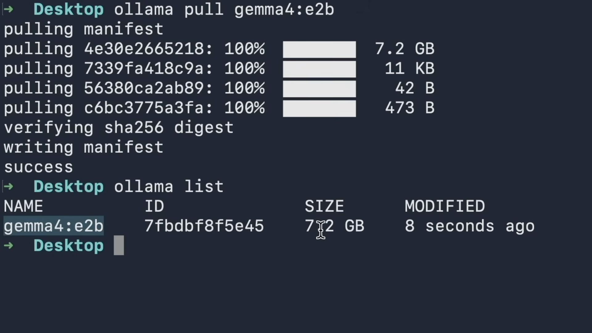 For example, you can run a command like ollama pull gemma4:e4b. Ollama will pull the manifest and download the open-source model directly to your computer.